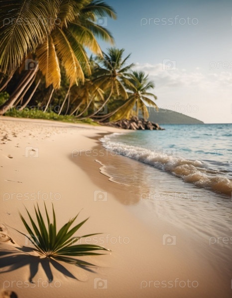 Спокойная пляжная сцена с мягкими волнами, песчаным берегом и пальмами, отбрасывающими тени. Яркие цвета и мягкие мазки создают умиротворяющую атмосферу. Сгенерированный ИИ. Путешествия на солнечном пляже