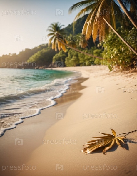 Спокойная пляжная сцена с мягкими волнами, песчаным берегом и пальмами, отбрасывающими тени. Яркие цвета и мягкие мазки создают умиротворяющую атмосферу. Сгенерированный ИИ. Путешествия на солнечном пляже