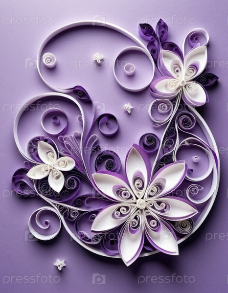 Бумажные цветы, выполненные в технике квиллинга. Цветы в оттенках фиолетового и белого, расположены по кругу на лавандовом фоне. Рамка с местом для копирования. Сгенерировано с помощью ИИ