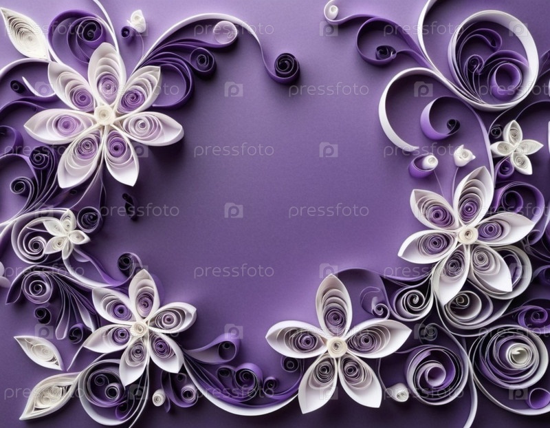 Бумажные цветы, выполненные в технике квиллинга. Цветы в оттенках фиолетового и белого, расположены по кругу на лавандовом фоне. Рамка с местом для копирования. Сгенерировано с помощью ИИ