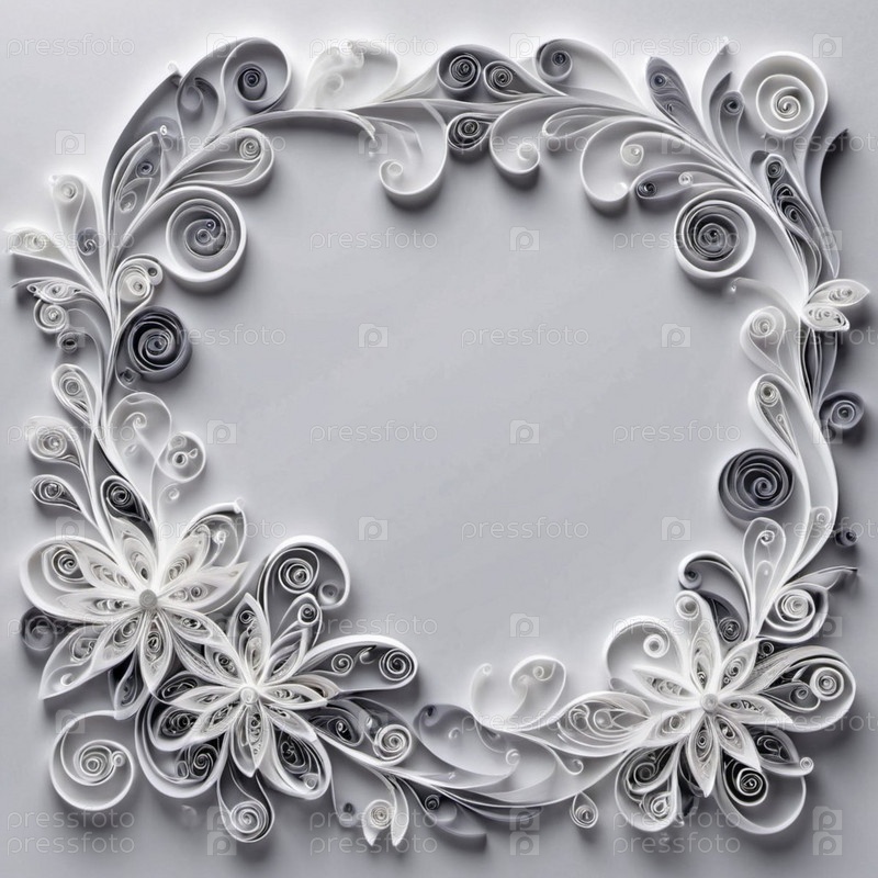 Бумажные цветы, выполненные в технике квиллинг. Цветы в оттенках серого и белого, расположены по кругу на сером фоне. Рамка с местом для копирования. Сгенерировано с помощью ИИ