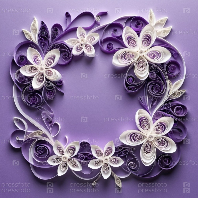 Бумажные цветы, выполненные в технике квиллинга. Цветы в оттенках фиолетового и белого, расположены по кругу на лавандовом фоне. Рамка с местом для копирования. Сгенерировано с помощью ИИ