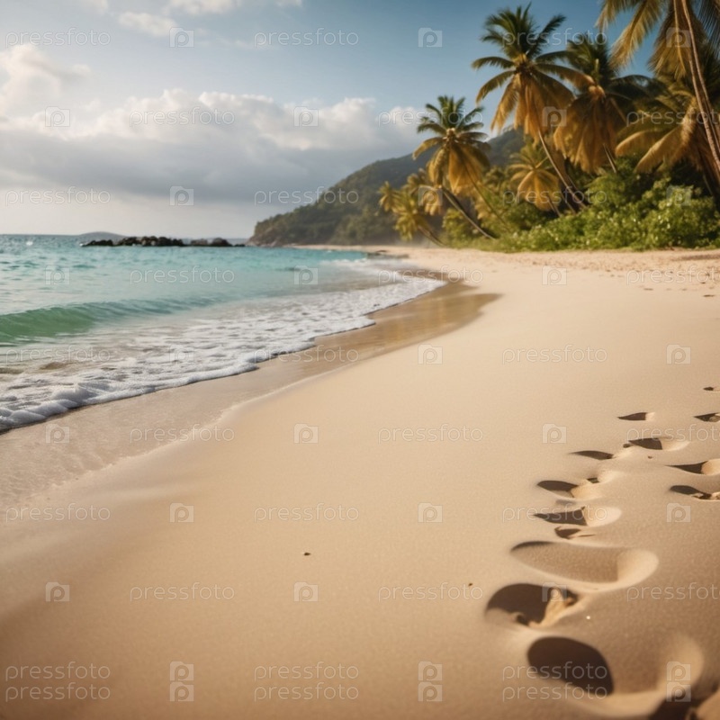Спокойная пляжная сцена с мягкими волнами, песчаным берегом и пальмами, отбрасывающими тени. Яркие цвета и мягкие мазки создают умиротворяющую атмосферу. Сгенерированный ИИ. Путешествия на солнечном пляже