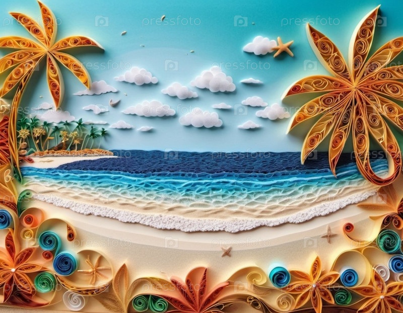 Спокойная пляжная сцена с мягкими волнами, песчаным берегом и пальмами, отбрасывающими тени. Яркие цвета и мягкие мазки создают умиротворяющую атмосферу. Сгенерированный ИИ. Путешествия на солнечном пляже