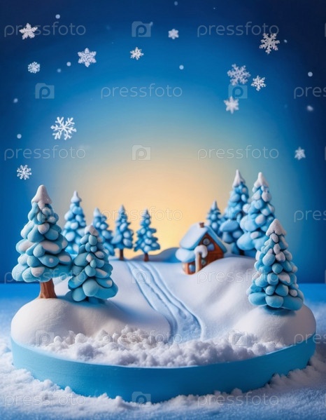 Причудливая деревня, пряничный домик, заснеженные крыши, окна и дымоход. Дом окружен снегом и снежинками. Синий фон боке. Праздничная и очаровательная зимняя страна чудес. Создано с помощью ИИ