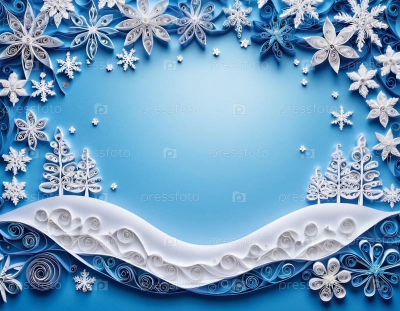 Крупный план бумажной работы в технике квиллинга, изображающей зимнюю сцену. Работа представляет собой завитки из белой бумаги, расположенные так, чтобы сформировать снежный пейзаж с деревьями и декоративной аркой из снежинок. Копировальное пространство.