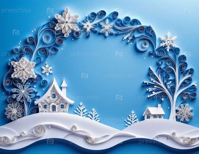 Крупный план бумажной работы в технике квиллинга, изображающей зимнюю сцену. Работа представляет собой завитки из белой бумаги, расположенные так, чтобы сформировать снежный пейзаж с деревьями и декоративной аркой из снежинок. Копировальное пространство.