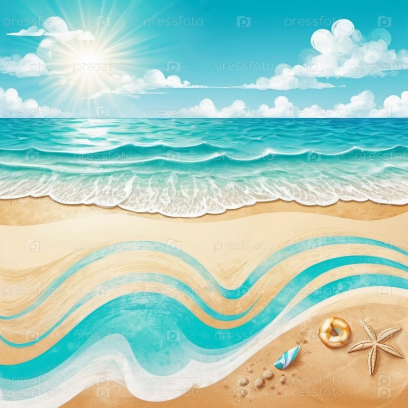 Художественная пляжная сцена с мягкими волнами, песчаным берегом. Яркие цвета создают умиротворяющую атмосферу. Сгенерированный ИИ. Концепция путешествия на солнечном пляже. Копировать пространство. Солнечный тропический рай. Фон пляжа