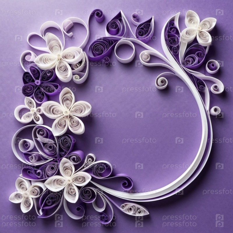 Бумажные цветы, выполненные в технике квиллинга. Цветы в оттенках фиолетового и белого, расположены по кругу на лавандовом фоне. Рамка с местом для копирования. Сгенерировано с помощью ИИ