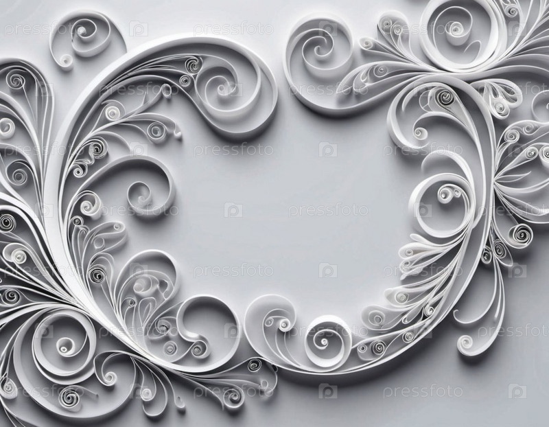 Бумажные цветы, выполненные в технике квиллинг. Цветы в оттенках серого и белого, расположены по кругу на сером фоне. Рамка с местом для копирования. Сгенерировано с помощью ИИ