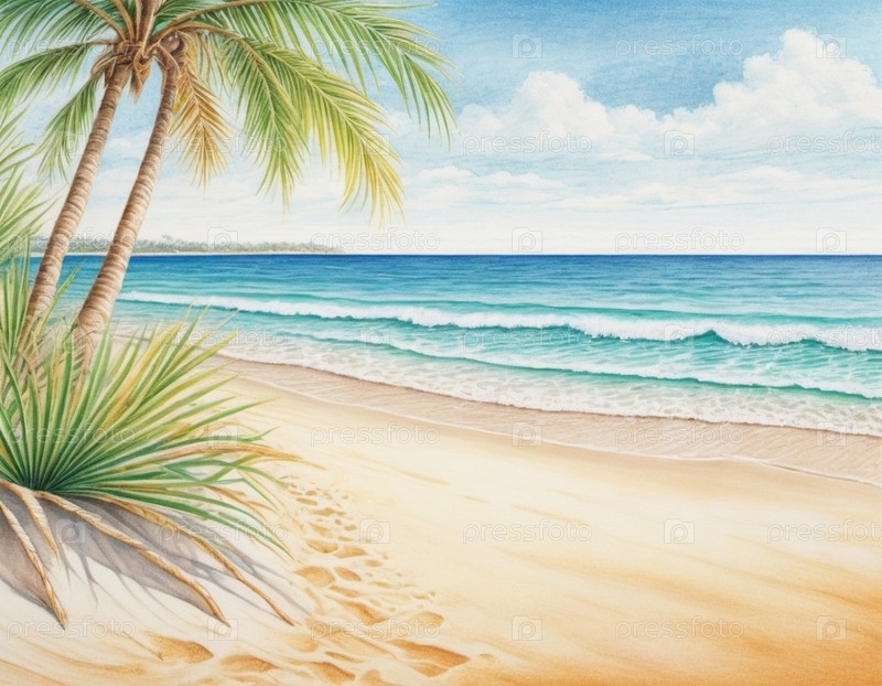 Спокойная пляжная сцена с мягкими волнами, песчаным берегом и пальмами, отбрасывающими тени. Яркие цвета и мягкие мазки создают умиротворяющую атмосферу. Сгенерированный ИИ. Путешествия на солнечном пляже
