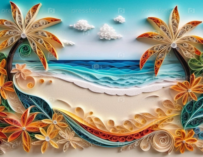 Спокойная пляжная сцена с мягкими волнами, песчаным берегом и пальмами, отбрасывающими тени. Яркие цвета и мягкие мазки создают умиротворяющую атмосферу. Сгенерированный ИИ. Путешествия на солнечном пляже