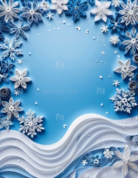 Крупный план бумажной работы в технике квиллинга, изображающей зимнюю сцену. Работа представляет собой завитки из белой бумаги, расположенные так, чтобы сформировать снежный пейзаж с деревьями и декоративной аркой из снежинок. Копировальное пространство.