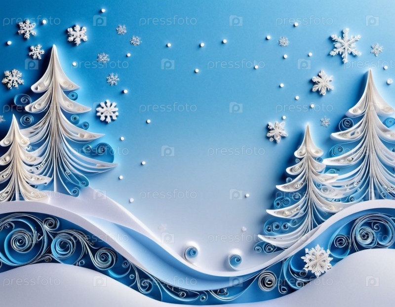Крупный план бумажной работы в технике квиллинга, изображающей зимнюю сцену. Работа представляет собой завитки из белой бумаги, расположенные так, чтобы сформировать снежный пейзаж с деревьями и декоративной аркой из снежинок. Копировальное пространство.