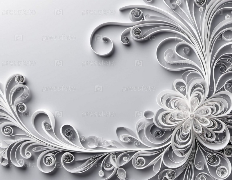 Бумажные цветы, выполненные в технике квиллинг. Цветы в оттенках серого и белого, расположены по кругу на сером фоне. Рамка с местом для копирования. Сгенерировано с помощью ИИ