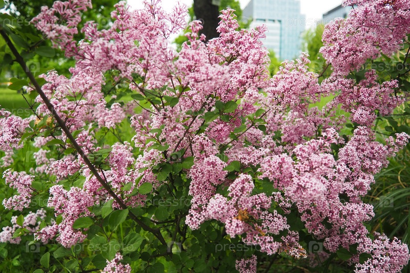 Красивые цветки розовой сирены на ветке в городском парке Варшавы, Польша. Красивые цветущие цветы сирены Syringa vulgaris. Весеннее цветение. Растение Syringa семейства оливковых или Oleaceae