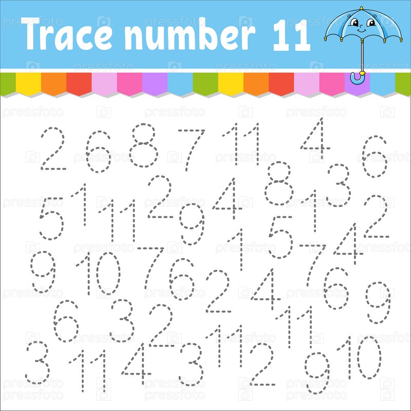 Номер трассировки. Практика письма. Изучение цифр для детей. Развивающий рабочий лист для обучения. Страница с заданиями. Векторная иллюстрация