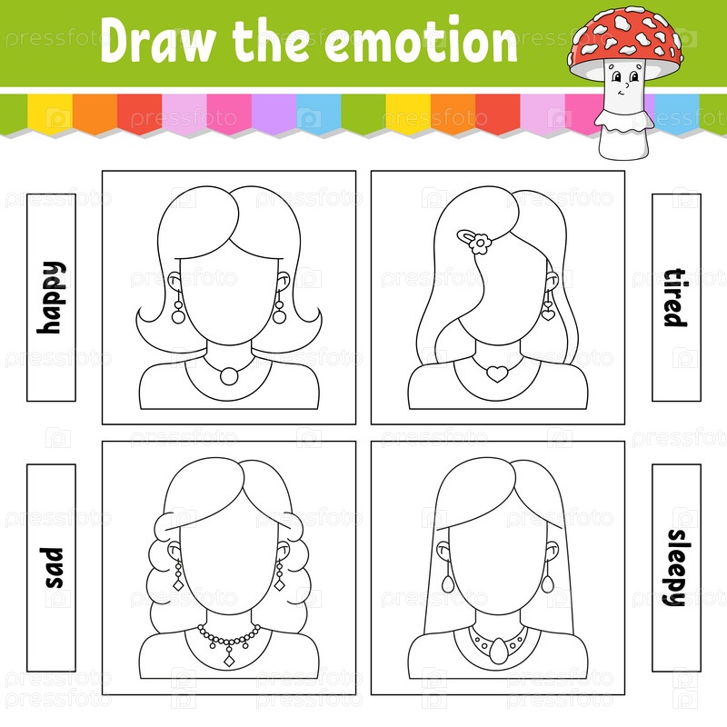Нарисуй эмоцию. Рабочий лист заверши лицо. Раскраска для детей. Веселый персонаж. Векторная иллюстрация. Черный контурный силуэт. Векторная иллюстрация