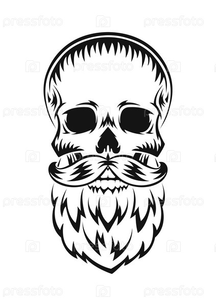 Человеческий череп с бородой и усами. Черный силуэт. Элемент дизайна. Нарисованный от руки эскиз. Винтажный стиль. Векторная иллюстрация