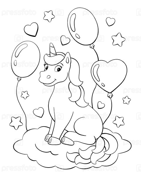 Подарочная цветная поздравительная открытка. Единорог сидит на облаке с воздушными шарами. Страница раскраски для детей. Тема дня рождения. Плоский стиль. Векторная иллюстрация