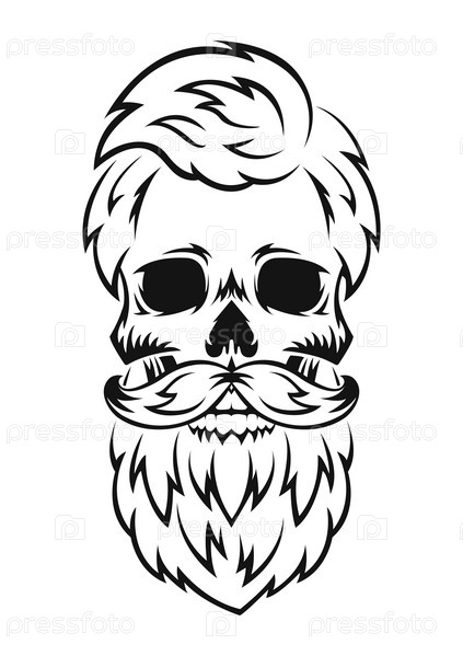 Человеческий череп с бородой и усами. Черный силуэт. Элемент дизайна. Нарисованный от руки эскиз. Винтажный стиль. Векторная иллюстрация