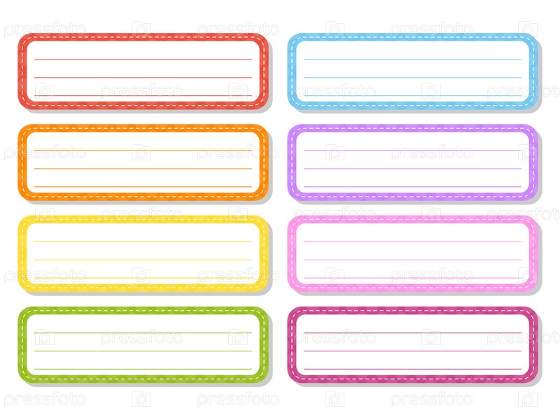Набор наклеек для дизайна. Пустой шаблон. Бирки, подарочные этикетки. Идеально подходит для папок, ежедневников, блокнотов, ланч-боксов, пеналов. Прямоугольная этикетка. Цветная векторная изолированная иллюстрация