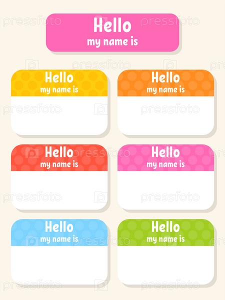 Привет, бейдж. Яркие наклейки. Прямоугольная этикетка. Цветная векторная изолированная иллюстрация