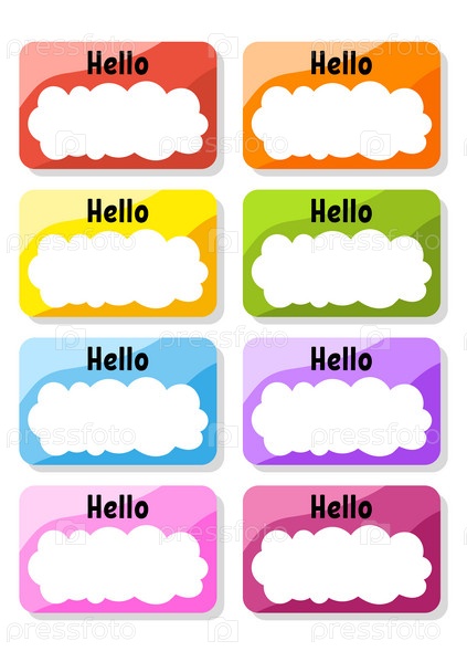 Привет, бейдж. Яркие наклейки. Прямоугольная этикетка. Цветная векторная изолированная иллюстрация