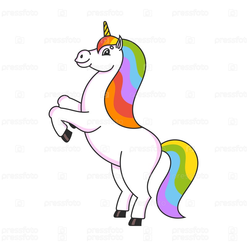 Волшебный единорог встал на дыбы. Животное-лошадь стоит на задних ногах. Мультяшный стиль. Простая плоская векторная иллюстрация
