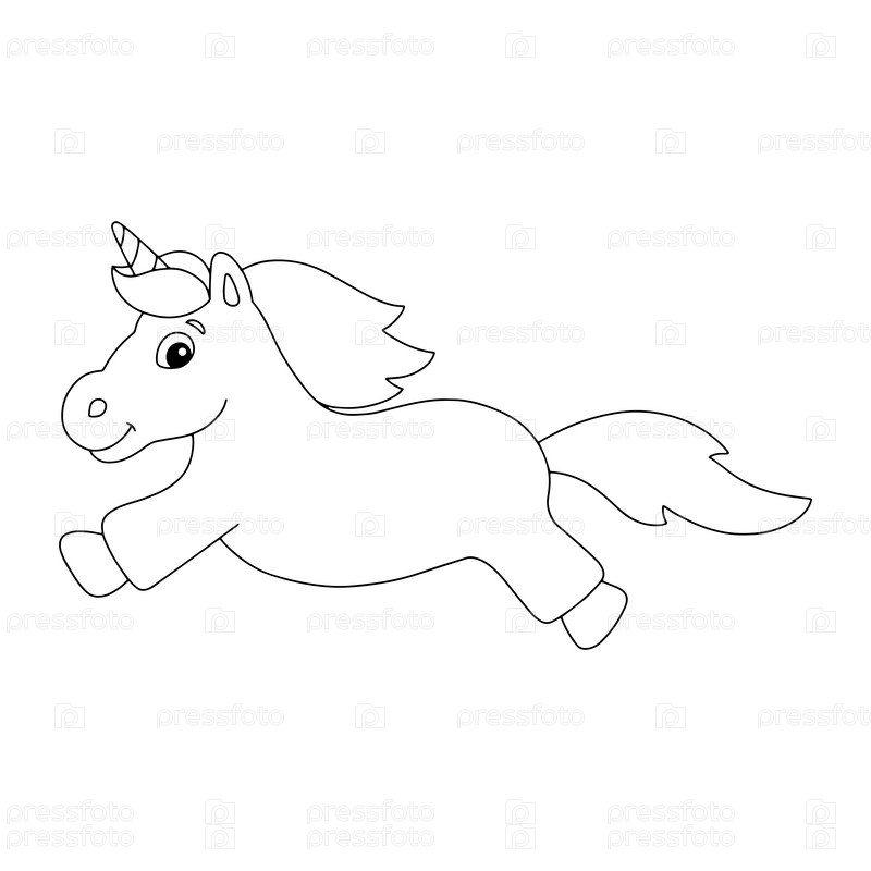 Летающий единорог. Раскраска для детей. Цифровая марка. Персонаж в мультяшном стиле. Векторная иллюстрация на белом фоне