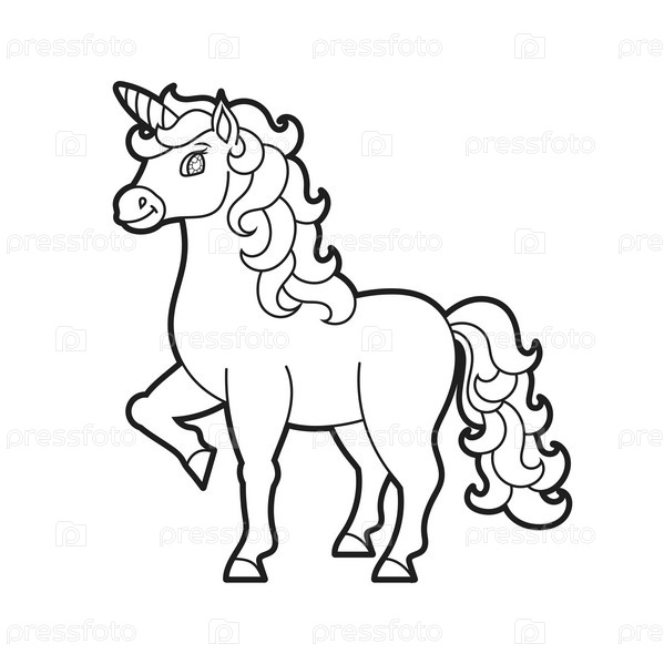 Милый единорог. Волшебная сказочная лошадь. Страница раскраски для детей. Мультяшный стиль. Векторная иллюстрация на белом фоне