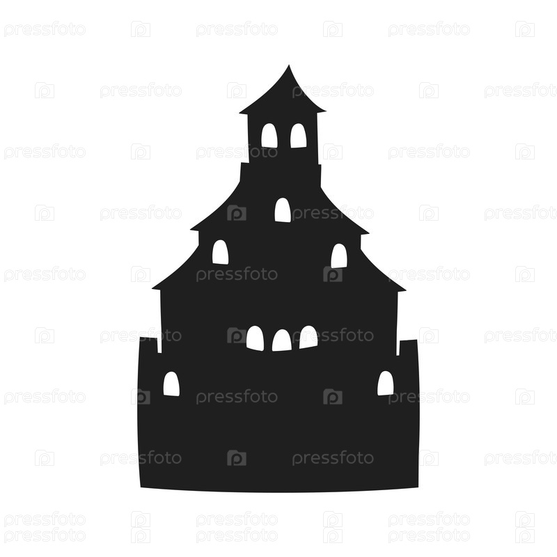 Сказочный замок. Черный силуэт. Элемент дизайна. Векторная иллюстрация на белом фоне. Шаблон для книг, наклеек, плакатов, открыток, одежды