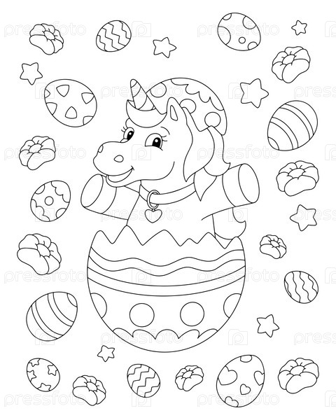 Веселый единорог празднует пасху. Раскраска для детей. Персонаж в мультяшном стиле. Векторная иллюстрация на белом фоне