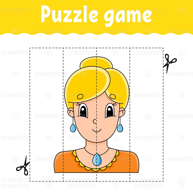 Игра-головоломка для детей. Практика вырезания. Образовательный развивающий рабочий лист. Страница с заданиями. Персонаж мультфильма. Векторная иллюстрация