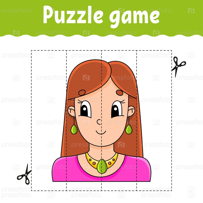 Игра-головоломка для детей. Практика вырезания. Образовательный развивающий рабочий лист. Страница с заданиями. Персонаж мультфильма. Векторная иллюстрация