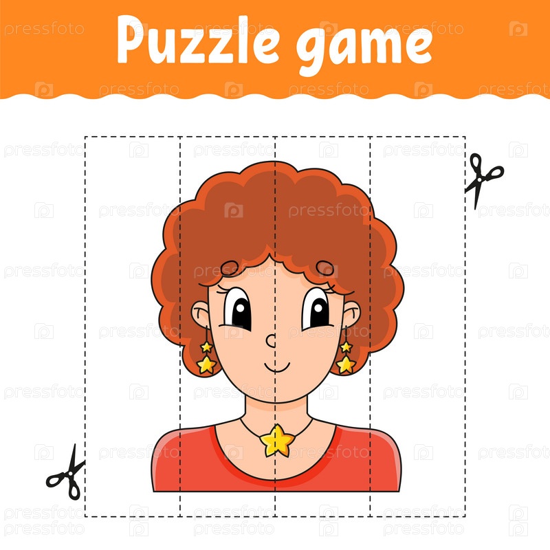 Игра-головоломка для детей. Практика вырезания. Образовательный развивающий рабочий лист. Страница с заданиями. Персонаж мультфильма. Векторная иллюстрация