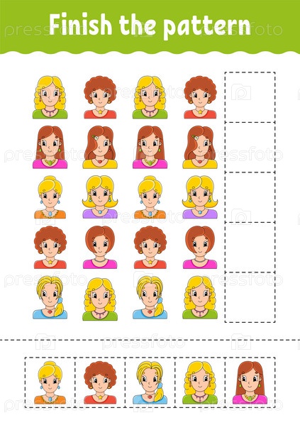 Закончите узор. Вырежьте и играйте. Образовательный развивающий рабочий лист. Страница с заданиями. Персонаж мультфильма. Векторная иллюстрация
