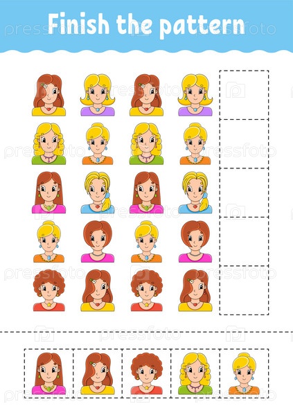 Закончите узор. Вырежьте и играйте. Образовательный развивающий рабочий лист. Страница с заданиями. Персонаж мультфильма. Векторная иллюстрация