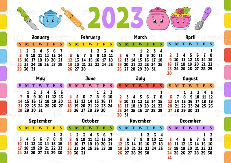 Календарь на 2023 год с милым персонажем. Веселый и яркий дизайн. Изолированная цветная векторная иллюстрация. Мультяшный стиль