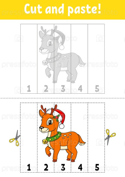 Изучаем цифры от 1 до 5. Вырезаем и склеиваем. Персонаж мультфильма. Развивающий рабочий лист. Игра для детей. Страница с заданиями. Векторная иллюстрация