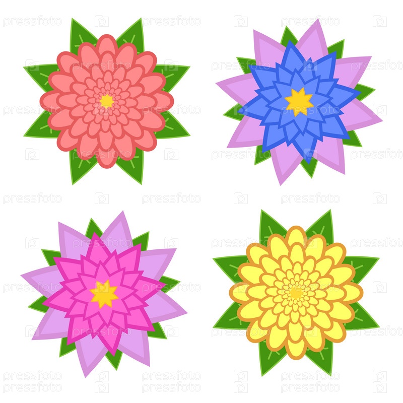 Набор красивых цветов разных оттенков с зелеными листьями, изолированных на белом фоне. Четыре варианта. Подходит для дизайна