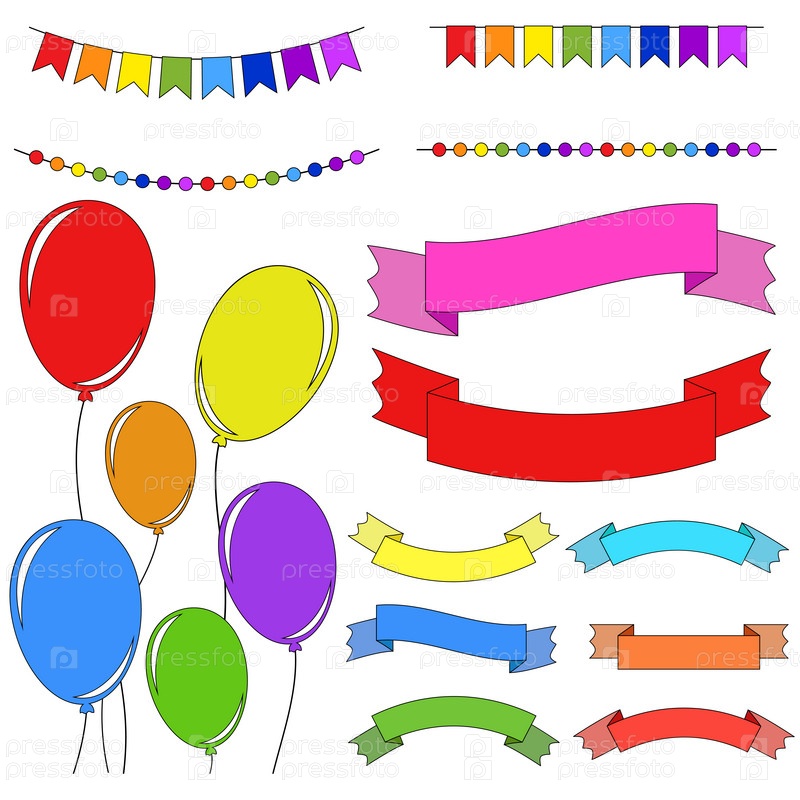 Набор плоских цветных изолированных воздушных шаров на веревках. Гирлянды и ленты баннеры