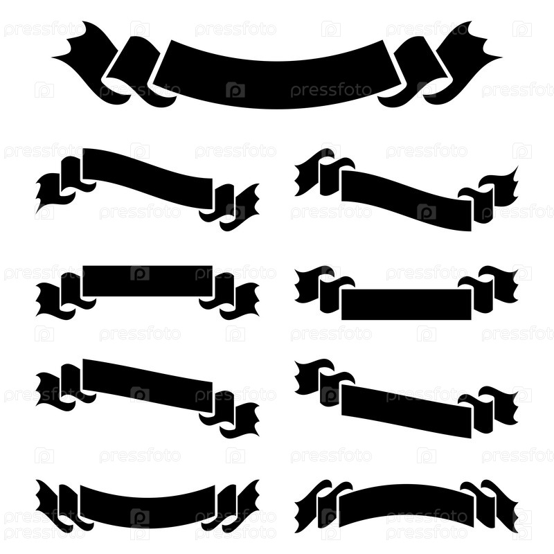 Набор плоских черных изолированных силуэтов лент-баннеров на белом фоне