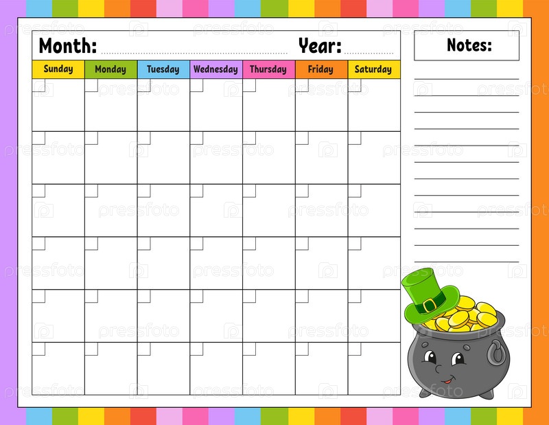 Пустой шаблон календаря на один месяц без дат. Красочный дизайн с милым персонажем. Векторная иллюстрация