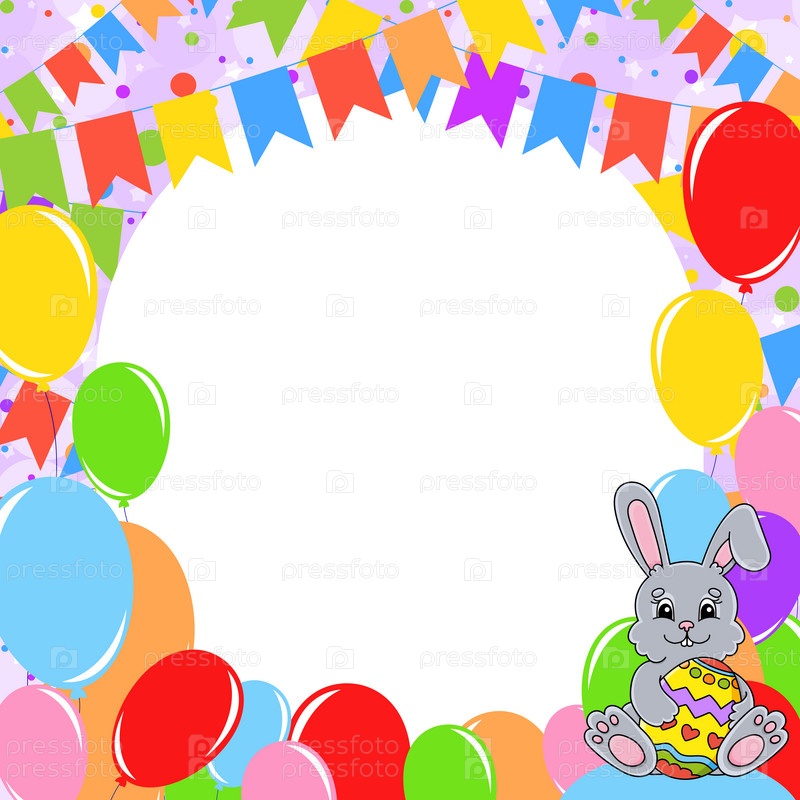 Поздравительная открытка с днем рождения с милым мультяшным персонажем. С местом для текста. Картинка на фоне ярких воздушных шаров, конфетти и гирлянд. Векторная иллюстрация