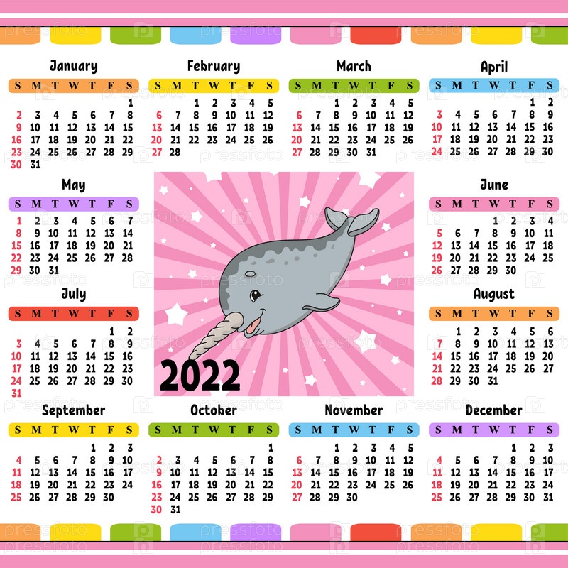 Календарь на 2022 год с милым персонажем. Веселый и яркий дизайн. Изолированная цветная векторная иллюстрация. Мультяшный стиль