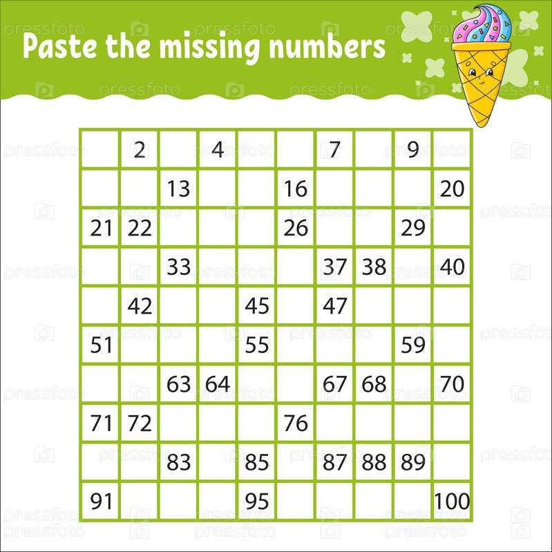 Вставьте пропущенные цифры от 1 до 100. Практика письма. Изучение цифр для детей. Развивающий рабочий лист. Страница с заданиями. Игра для детей