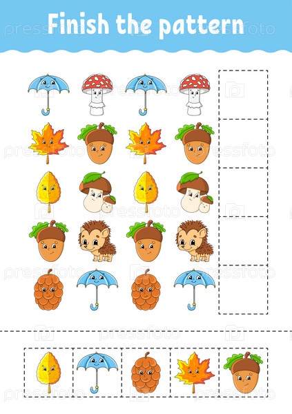 Закончите узор. Вырежьте и играйте. Образовательный развивающий рабочий лист. Осенняя тема. Страница с заданиями. Персонаж мультфильма. Векторная иллюстрация