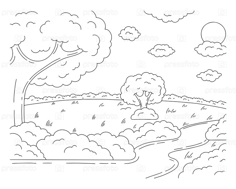 Замечательный природный ландшафт. Раскраска для детей. Мультяшный стиль. Векторная иллюстрация на белом фоне