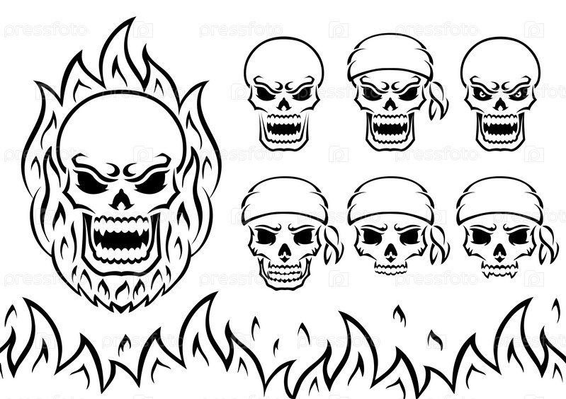 Злой череп. Контур силуэта. Элемент дизайна. Векторная иллюстрация изолирована на белом фоне. Шаблон для книг, наклеек, плакатов, карт, одежды